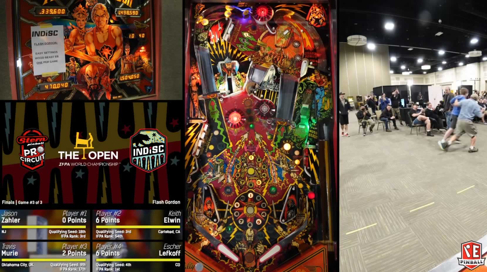 Keith Elwin and Escher Lefkoff were tied going into the last game. Escher was trailing by a significant amount going into the last ball. However, this game of Flash Gordon was set to award one extra ball which The Players were allowed to play if they earned it.