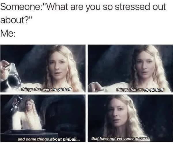 So that was my Pin-Masters experience. Except I did finish in the top-16 (14th), which my best result at this event going back to the times when it was in Las Vegas at the old Pinball Hall of Fame location. I’m still unsure why I get so stressed. My best guess is that I really want to keep playing this ball I have right now. I don’t wanna die, because I’ll have to stop playing. If I’m not playing, I’m waiting around for my turn again. While I’m waiting, I’m forgetting where the shots are and my game state which I have to relearn when I get back up there. Sometimes on my next turn, I’ll drain again while I’m doing all that ‘relearning’, and the cycle of despair continues. Never mind that the game’s lighting might be distracting. That, along with a dark environment can make a moving ball disappear from view. Especially when the darkness is broken by overly complicated light animation celebrations before retuning to the darkness again.