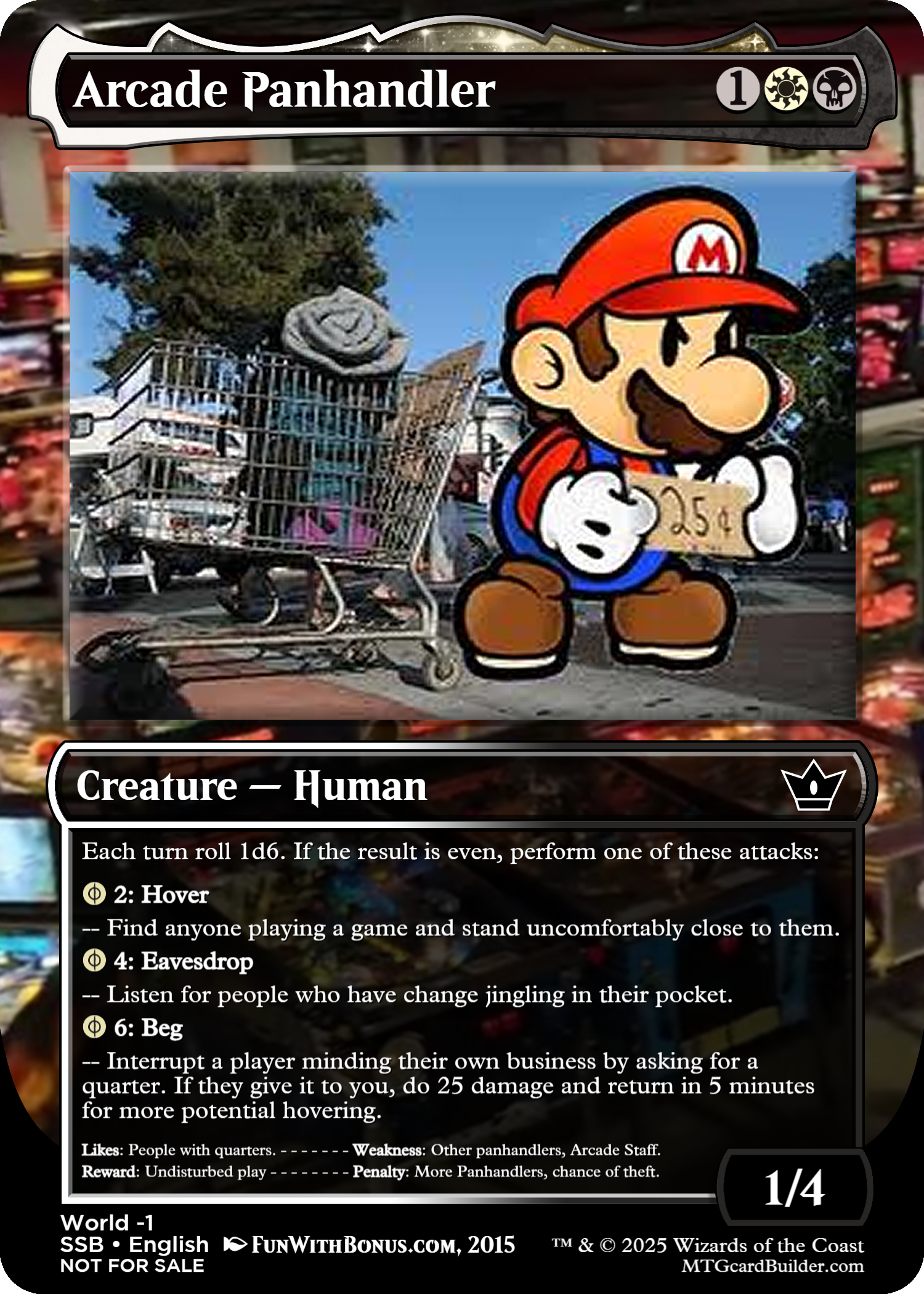 I believe this card goes back to 2012 although my latest edited date for the original card says 2015. Maybe 2012, because I made a post back then (“Dude, do you have fifty cents I can borrow?”). It was about an encounter I had at an arcade, after I had already created the card and the one you’ll see in an upcoming post.