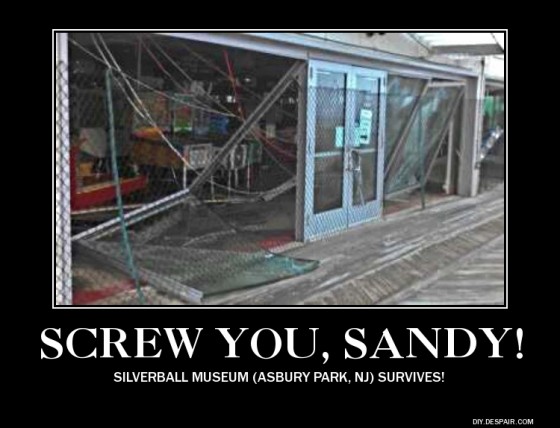 Senior Pinball Correspondent, Steve [ZAP] Zahler has a special report on the condition of the Silverball Museum in Asbury Park, New Jersey. Sandy proved that even hurricanes / post-tropical cyclones want to play pinball too. Unfortunately, Sandy didn’t know how to nudge gracefully. Cue the Rocky/Karate Kid training montage music!