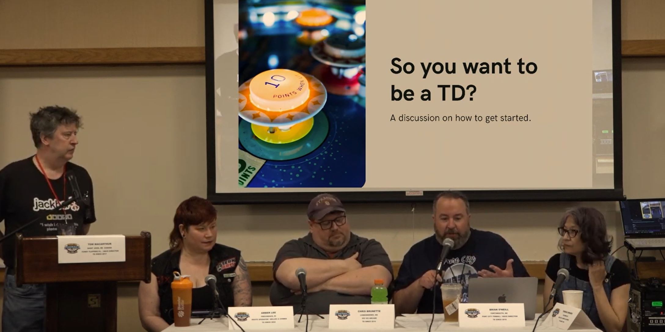 Moderator Tom MacArthur and Panelists Amber Lee, Chris Brunette, Brian O’Neill, and Therese Edwards give a talk at the Pintastic New England event. They give details on how to run quality pinball tournaments using their prior experiences.